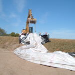 30.) Non-abrasive fill material was laid on parts of the AquaDam® so that the excavator could track over the dam without damaging it.