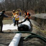 This photo demonstrates how workers maneuvered the AquaDam® over the flume pipe that was required for fish passage. The ropes restrain the roll and keep it from unrolling until a sufficient amount of water has been pumped inside the AquaDam® to supply the needed internal pressure to counteract the forces from the stream flow.