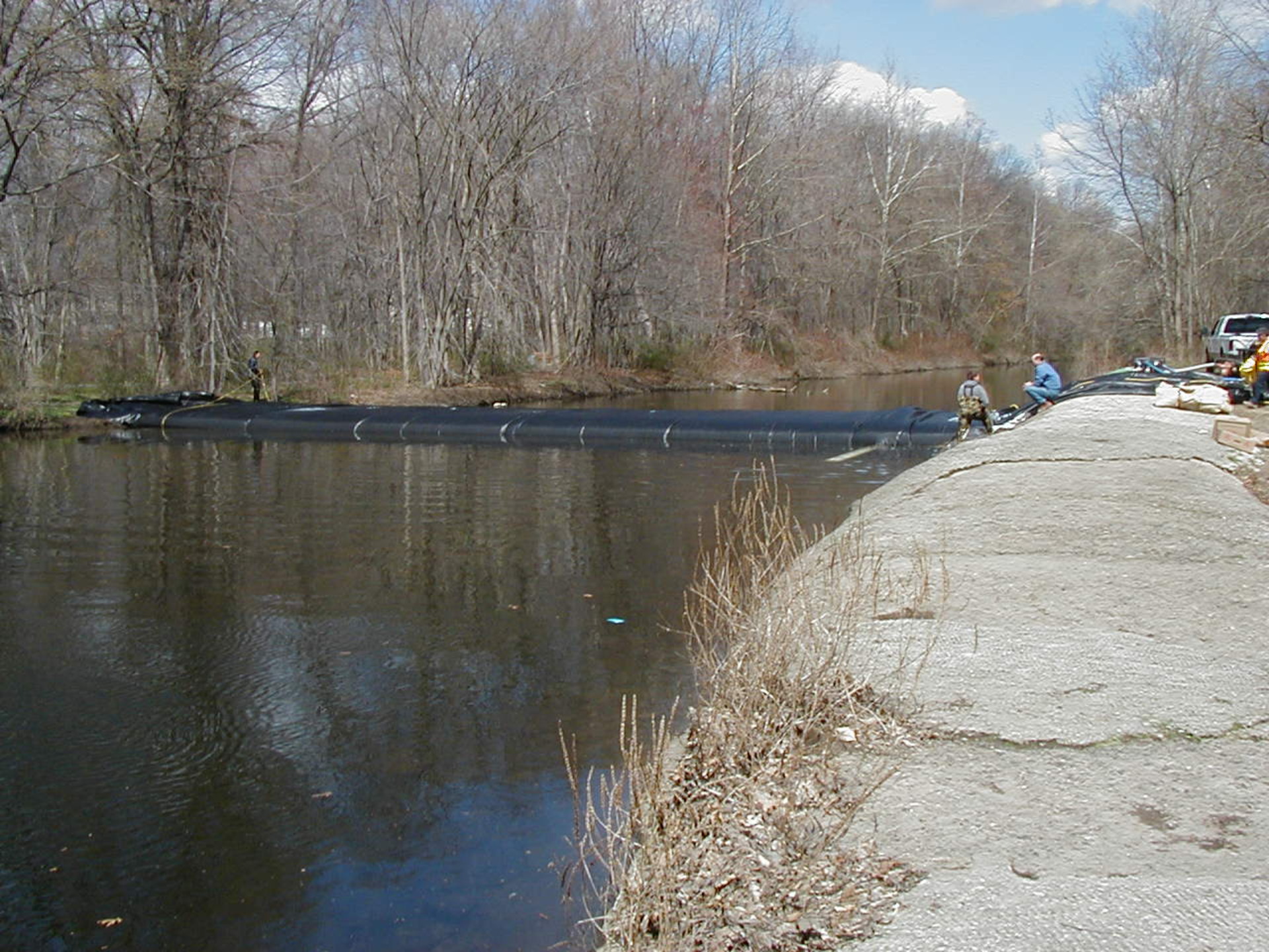 The open end of the 6ft tall SCE AquaDam® can be seen here in this photo. Workers tied the open end back to trees to keep it from sliding down the starting bank, as the AquaDam® was filled with water.