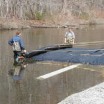 The 6ft tall SCE AquaDam® has been launched off its starting bank and is ready to be filled with the stream water. Ropes have been anchored at shore, run under the AquaDam, over top of the roll, and back to workers who control the roll while the dam is being filled with water. The ropes are used to hold back the roll, while the unrolled length fills and gains head above the surrounding water.