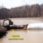 A 4ft tall, 68ft long black AquaDam® was installed over the culvert and its closed end was joined to the closed end of an 8ft tall, 100ft long white AquaDam. Fill material was also placed where the two closed ends met. The white AquaDam® then attached to another 100ft long white AquaDam, which was launched from the opposite bank.